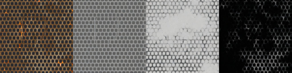 close-up of metal mesh background lights fire on dark background. metal sheet with holes. BBQ. The fire in the grill. |
